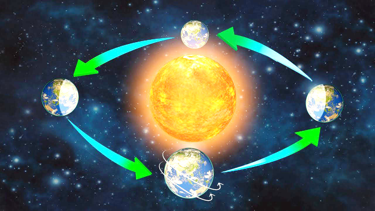 One revolution takes 365 days (365 rotations) to fully orbit around the sun. Revolution also causes the different seasons.Spring,Summer,Autumn and Winter are all caused by the revolving of the earth around the sun. The Northern and Southern hemispheres both have different seasons and is caused by earth’s axis.