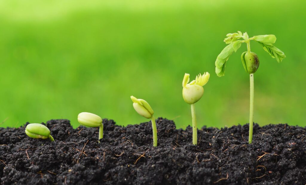 SEED GERMINATION is the process by which an organism grows from a seed or spore. STAGES OF SEED GERMINATION : Imbibition-the seed absorbs water, swells, and activities that enzymes the growth process. Respiration-the seed uses oxygen to break down the stored food and release energy. Mobilization- the seed digests and translocates the food to the growing parts of the embryo. Growth-the seed develops a root (radicle) and a shoot (plumule) that extend towards the water and the light sources. Development: the seedling produces leaves and starts photosynthesis.